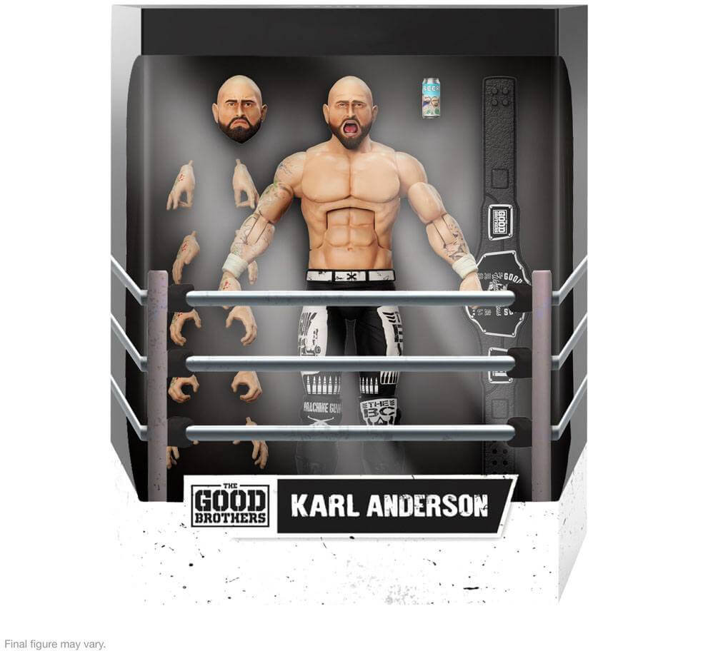 Denna 7" skala Karl Anderson ULTIMATES-figur inkluderar flera utbytbara huvuden och händer, en ölburk och ett Good Brothers-titelbälte.