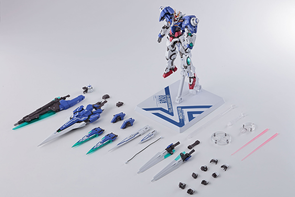 Incredibly detailed and posable, the 18 cm diecast and plastic figure includes 4 optional pairs of hands, 2 GN Beam Sabers, 2 beam swords, a long GN Sword II, a short GN Sword II, a joint grip, a wire, a GN Buster Sword II, 2 GN Katars, GN Sword II Blaster, L/R shoulder joints, optional GN Drive, 2 GN Sword IIs, 2 optional knee parts, display stand set, and weapon stand set.