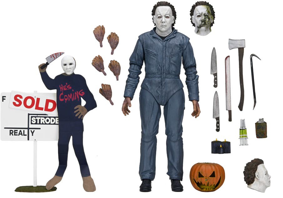 Standing in 7-inch scale, this Ultimate Michael Myers action figure includes interchangeable heads, removed mask, multiple interchangeable hands, axe, machete, crowbar, kitchen knives, bag of runes, sacrificial candles, bundle of syringes, and pumpkin. Plus, a Strode Realty sign with Michael Myers cutout.
