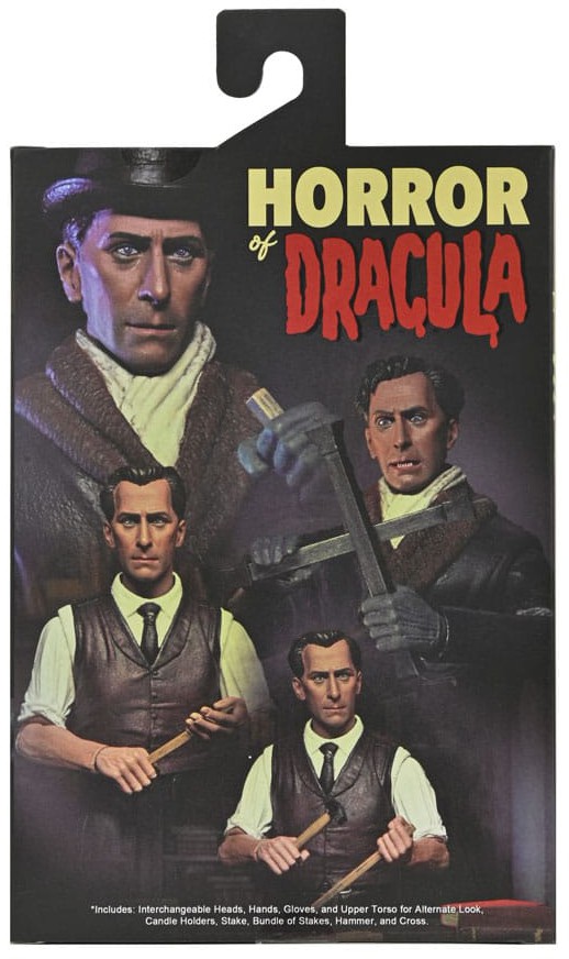 Accessories include interchangeable heads, hands, and gloved hands, as well as a cross, hammer, wooden stake, wooden stake bundle, and two candle holders. Comes in collector-friendly window box packaging with opening front flap.
