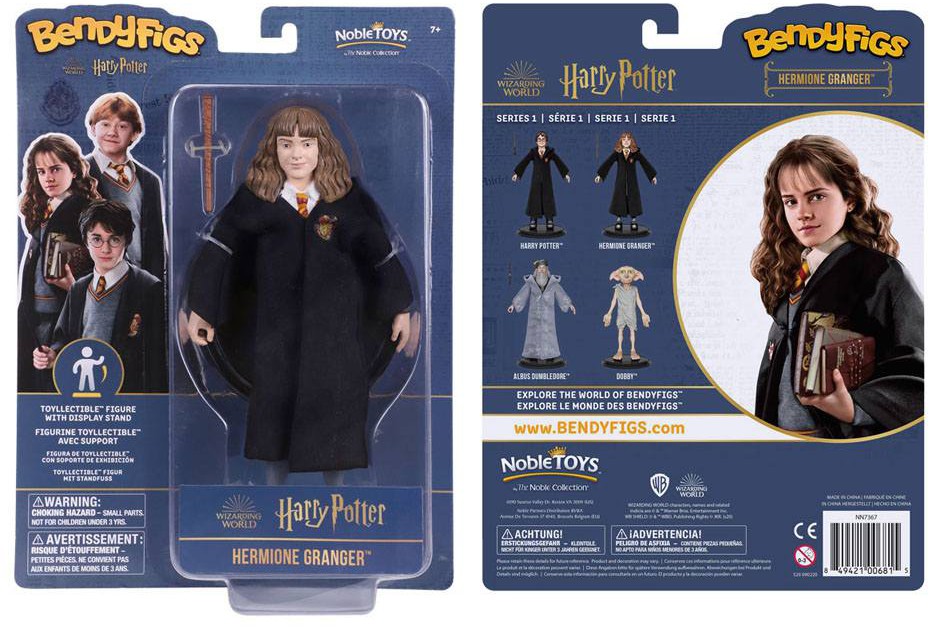 Each fully posable figure stands approximately 7.5 inches in height. Harry, Hermione and Dumbledore come in cloth Hogwarts robes with their wands. Dobby and the other three figures come with a Wizarding World branded display stand. All on four colour blister cards that allow them to be displayed on a shelf or hung from a hook.