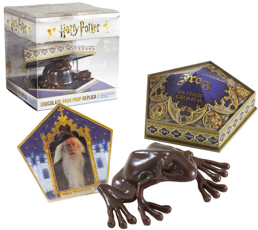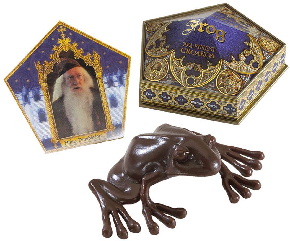 Innehåller en icke ätbar chokladgroda-replika som sedd i Honeydukes Sweetshop. Mosa den, sträck den eller bara beundra den på ditt skrivbord. Innehåller en detaljerad ask och ett Dumbledore Famous Witches and Wizards kort.