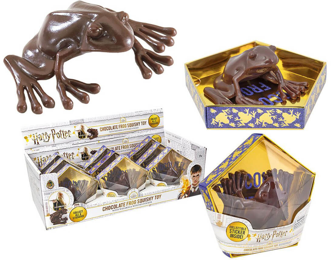 Innehåller en icke ätbar chokladgroda-replika som ses på Honeydukes Sweetshop. Mosa den, sträck den, eller bara beundra den på ditt skrivbord. Innehåller en detaljerad ask och ett Dumbledore Famous Witches and Wizard kort.