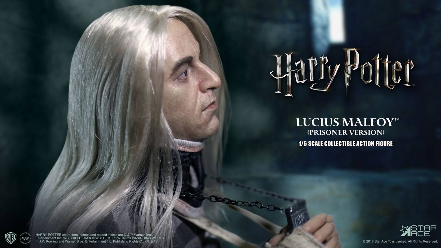 He was the right hand of He Who Must Not be Named but fell into disgrace after being captured and sent to Azkaban prison after the events in Harry Potter and the Order of the Phoenix. The latest 1:6 scale collectible figure in the Star Ace Harry Potter line is Lucius as a prisoner in Azkaban. This movie-accurate collectible figure features realistic hair and an authentic likeness of Jason Isaacs as Lucius Malfoy as seen in Harry Potter and the Half-Blood Prince. His prisoner placard, shackles, neck brace and arm sling, as well as his snake-head wand/cane are included.