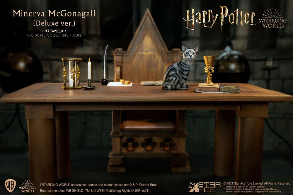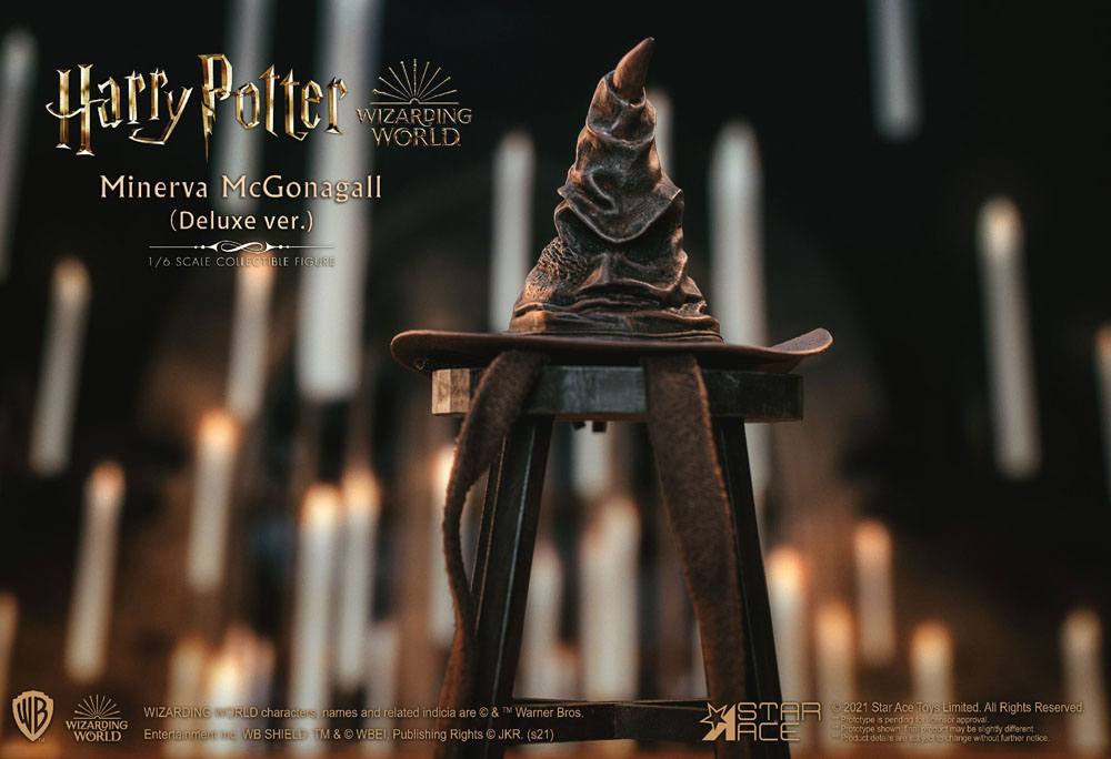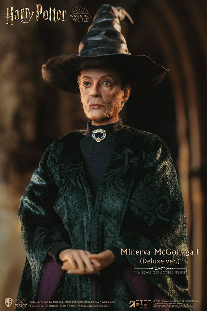Denna figur av professor McGonagall i skala 1/6 har en autentisk likhet med Maggie Smith och en exakt filmdräkt. Hon kommer med sorteringshatten, hennes kattform med omvandling, en pall och andra tillbehör.