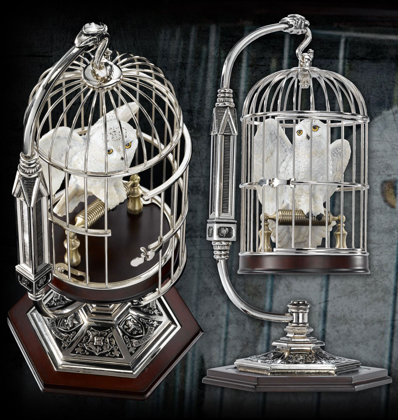 A beautiful miniature recreation of Hedwig in her cage. An arched pedestal display is included to hang the cage. Measures 25 cm in height.