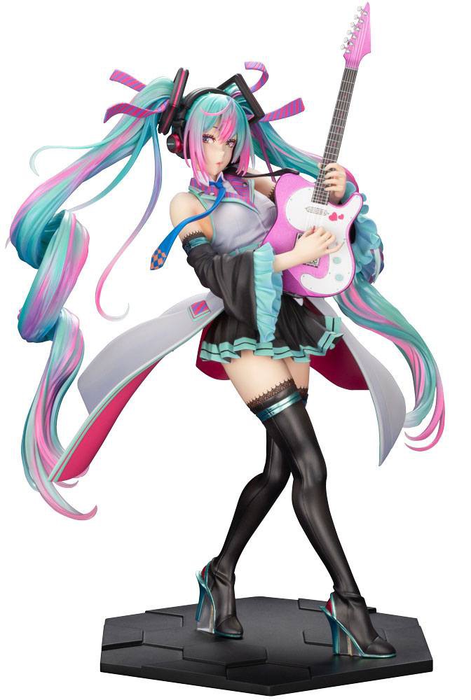 Shunya Yamashita designed Hatsune Miku's original outfit with frills all over, which was then faithfully recreated thanks to Kotobukiya's expert craftsmanship. Emulating how her jacket moves and sways, this figure fully captures her performance as she strums her guitar on stage.