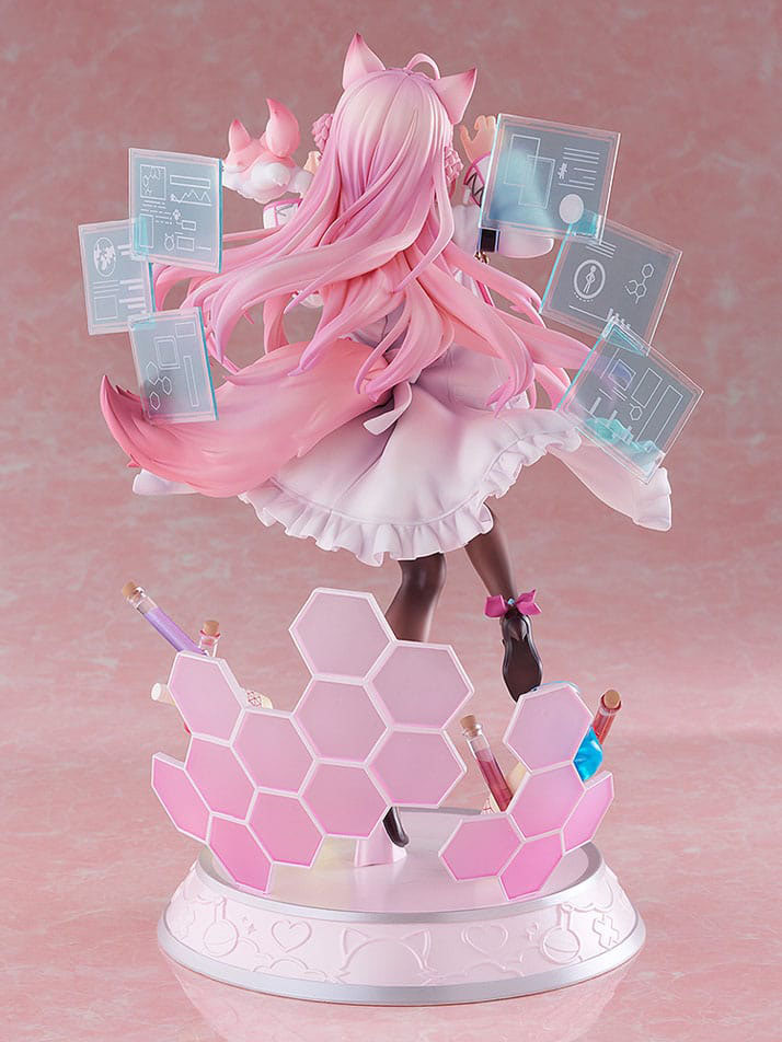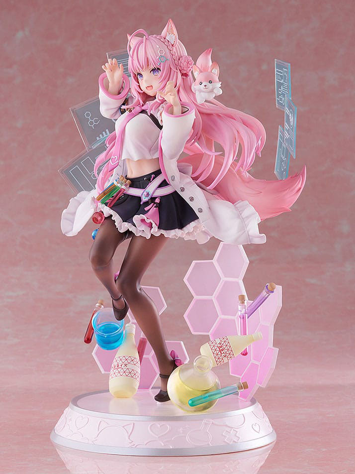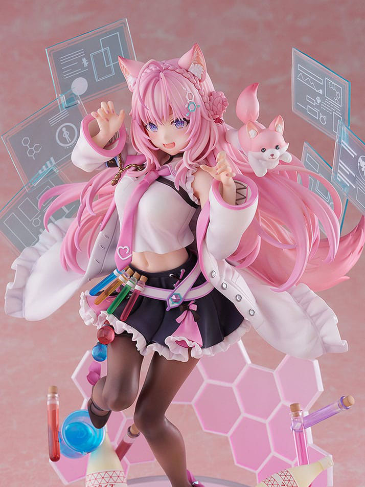 The figure doesn't shy away from showcasing her alluring qualities, artfully highlighting her subtly revealed waist and the delicately rendered skin texture peeking through her stockings. The transparent monitor elegantly raised behind her, complemented by flasks scattered at her feet, weaves together a narrative of sophistication that reflects Koyori's research-driven persona. Kokoro's gentle, round eyes draw you in, radiating an undeniable charm that belies her robotic nature. The base of the figure is thoughtfully adorned with test tubes colored by each member of holoX and Koyori's favorite mayonnaise, culminating in a vibrant and playful representation that perfectly encapsulates her lively personality.