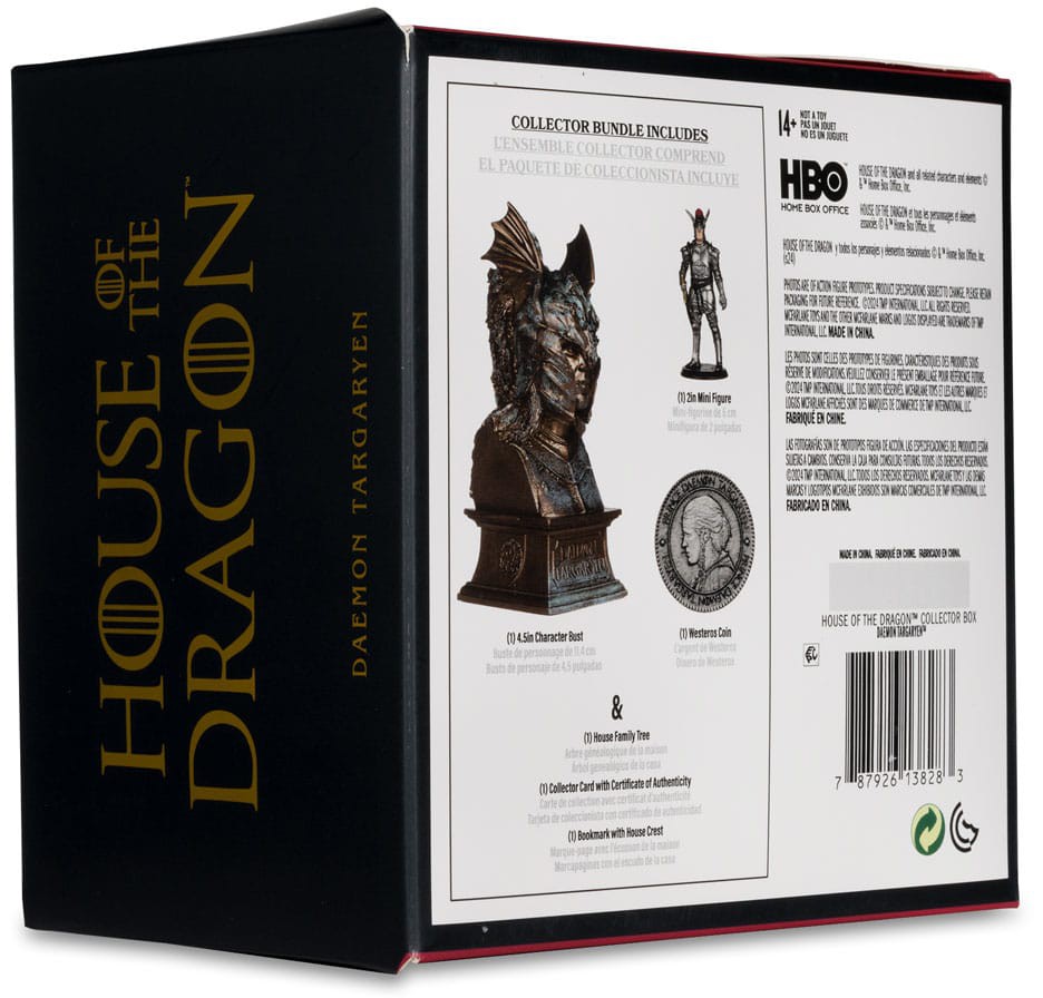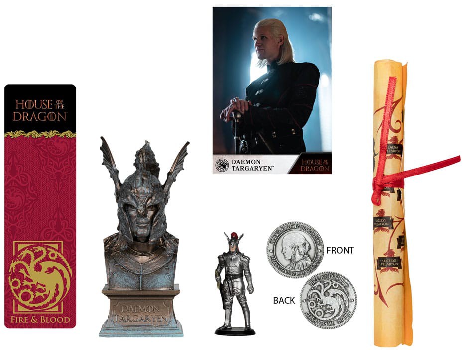 Innehåller minifigur på 5 cm, karaktärsbyst på 12 cm, mynt, husets släktträd, samlarkort med äkthetscertifikat och bokmärke med husets emblem.