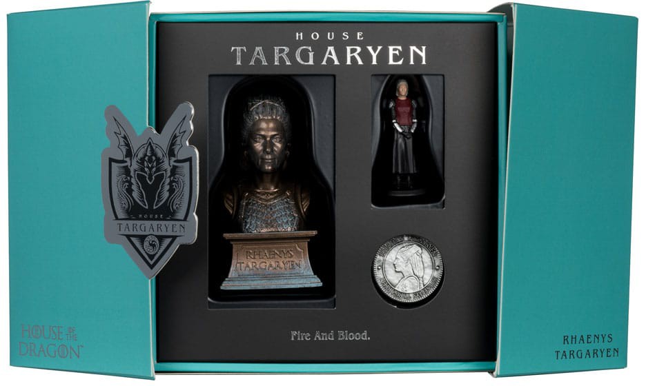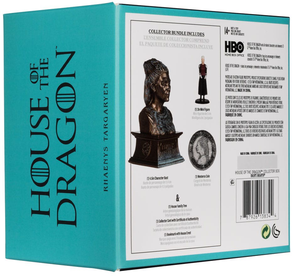 Innehåller minifigur på 5 cm, karaktärsbyst på 12 cm, mynt, husets släktträd, samlarkort med äkthetscertifikat och bokmärke med husets emblem.