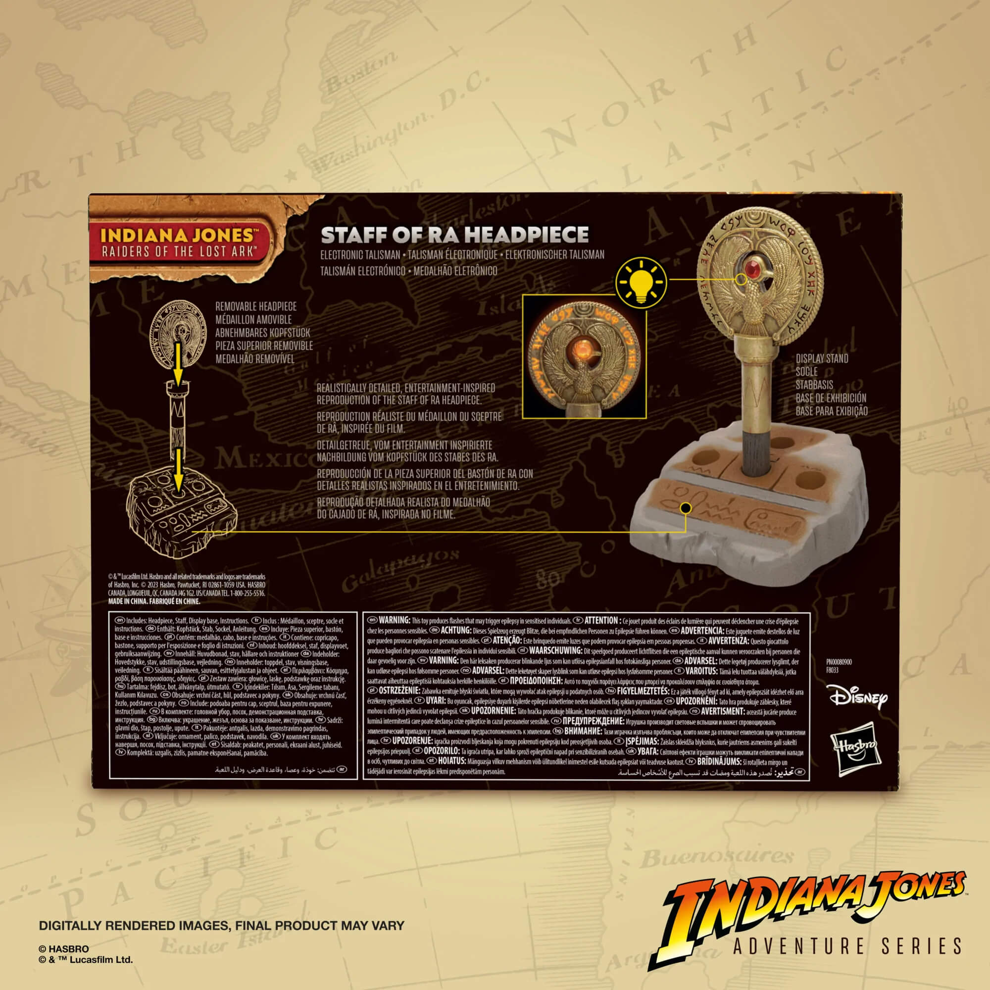 Fans and collectors can imagine the heart-stopping action and adventure of Indiana Jones with the Indiana Jones Adventure Series! With exquisite features and decoration, this series unearths the quality and realism that Indiana Jones devotees love. The Adventure Series includes figures and roleplay items from the 40-plus-year legacy of the adventures of Indiana Jones. (Each sold separately. Subject to availability.) This Adventure Series Staff of Ra Headpiece electronic collectible roleplay talisman is designed to look like the fabled medallion featured in Indiana Jones and the Raiders of the Lost Ark. The removable headpiece, featuring a premium metallic look and feel, is great for on-the-go Indiana Jones cosplay and makes a great addition to any Indiana Jones costume. Makes a great Indiana Jones gift. If adventure has a name, it must be Indiana Jones!