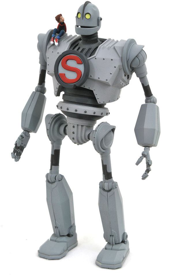 A Diamond Select Toys release! The Iron Giant has landed, and he's the newest Select action figure! Based on the classic 1999 animated film, this approximately 9-inch action figure features approximately 16 points of articulation, has light-up eyes, and features removable Hogarth Hughes and "S" Shield accessories! Packaged in display-ready Select action figure packaging, with side-panel artwork for shelf reference