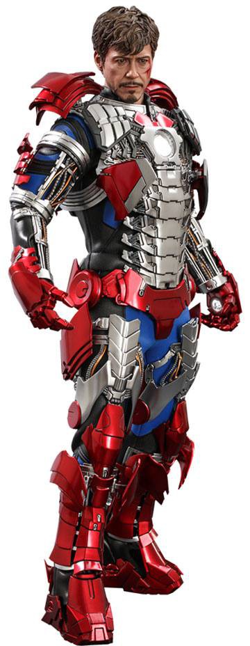 The movie-accurate figure is finely crafted based on Robert Downey Jr. as Tony Stark/Iron Man in the movie, features a newly developed Tony Stark head sculpt with specially applied battle-damaged effects; a stunningly detailed racing suit; LED light-up function design on arc reactor, and forearms; attachable Iron Man Mark V armor parts in defined proportion including helmet, chest and shoulders armor, upper back armor, thigh, and calf armors, hands with articulated fingers; skillfully painted in red and silver coloring with an astonishing metallic appearance; several pieces of interchangeable armors for different assembling looks; and a figure base.