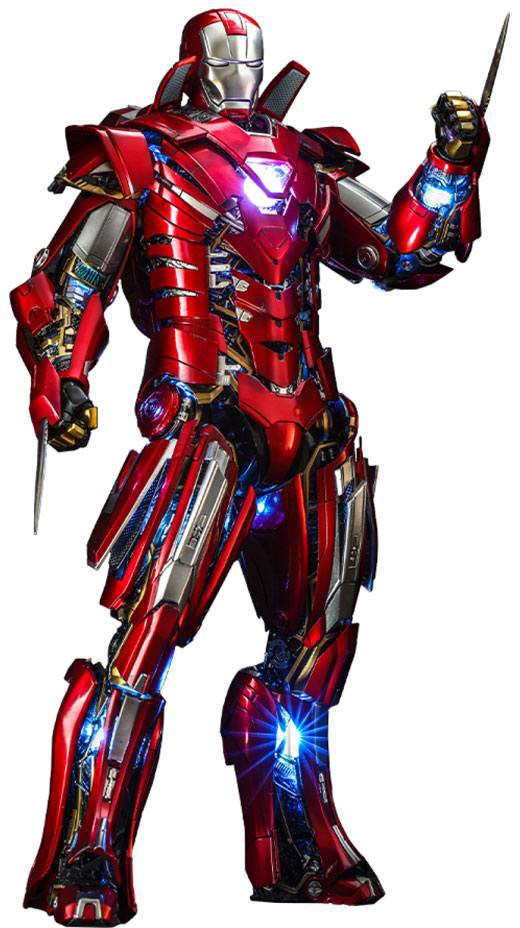 Utformad baserad på Silver Centurion i Iron Man 3, den gjutna figuren har en nymålad hjälm huvudskulptur med stridskadeffekter; ett nydesignat hjälmhuvud med LED-light-funktion och avtagbar mask; rustningsdräkt skickligt målad i röd och silverfärg med metalliskt utseende; invecklad design av rustningarna som återskapar dess komplexa struktur och mekaniska detaljer; LED-ljusfunktioner utspridda över armar, ben, Arc Reactor på bröstet och ryggen; ett par gjutna underarmsblad, utbytbara händer och ett stativ.