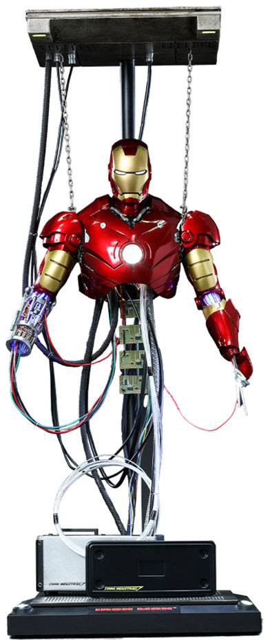I den första Iron Man-filmen reparerar Tony Stark Mark III som hänger i taket med komplexa kablar och ledningar anslutna till den högteknologiska rustningen.