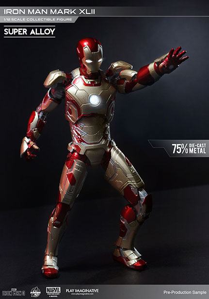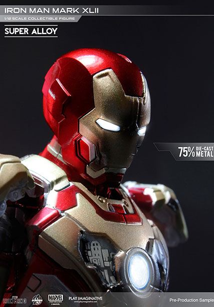 The Super Alloy 1/12 Scale Iron Man Mark XLII is a 75% metal alloy fully articulated figurine. This model features Iron Man's Mark XLII armor made popular in the Iron Man 3 movie. This model is lighted with lights in eyes and chest, resulting in an impressive display.