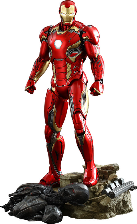 The movie-accurate Mark XLV Collectible Figure is highly detailed and sophisticatedly crafted based on the image of the armor in the film; featuring a meticulously sculpted armored body, specially applied metallic red, gold and silver colored paint with weathered effects, LED light-up Arc Reactor with hexagonal-shaped indent on chest, and a specially designed diorama base with a detachable damaged Ultron Sentry (Prime)!
