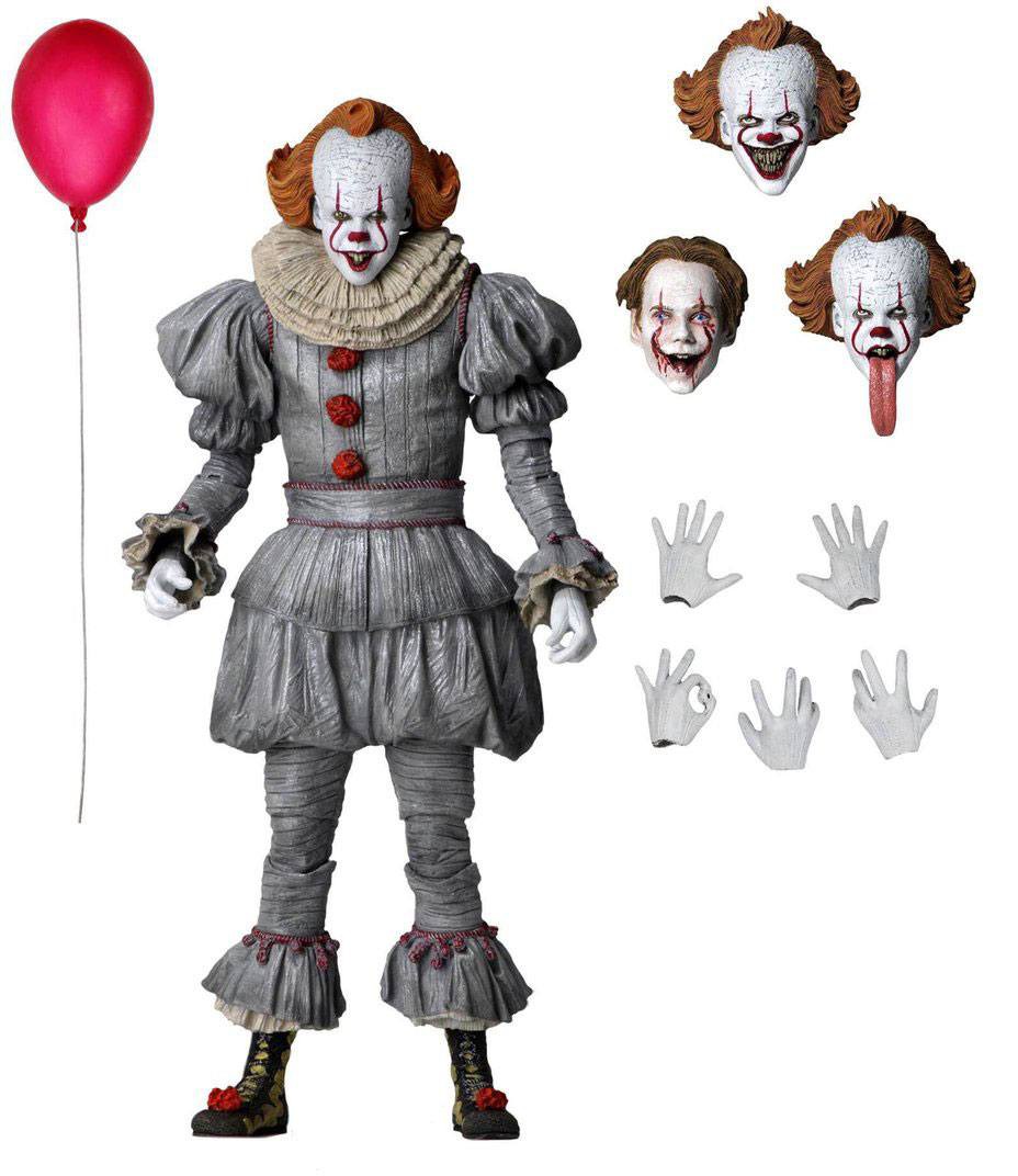 Baserat på Bill Skarsgårds skildring av den formförskjutande varelsen, har denna 7-tums skaliga figur en helt ny kropp för att visa upp Pennywises kostymförändring i den andra filmen. För att återskapa de mest skrämmande scenerna från filmen har den helt artikulerade figuren fyra utbytbara huvuden, plus utbytbara händer och röd ballong.