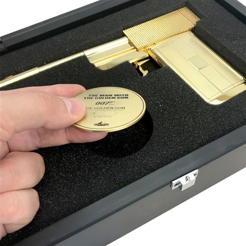 Den här fantastiska replikan i 1:1-skala av Golden Gun, officiellt licensierad av Danjaq LLC och EON Productions, har skapats efter noggrann studie och forskning av originalrekvisita i EON-arkiven samt intervjuer med originalbesättningar. Replikan kan monteras och demonteras i dess bearbetade och gjutna metall, 24k guldpläterade komponentdelar, exakt enligt originalproppen.