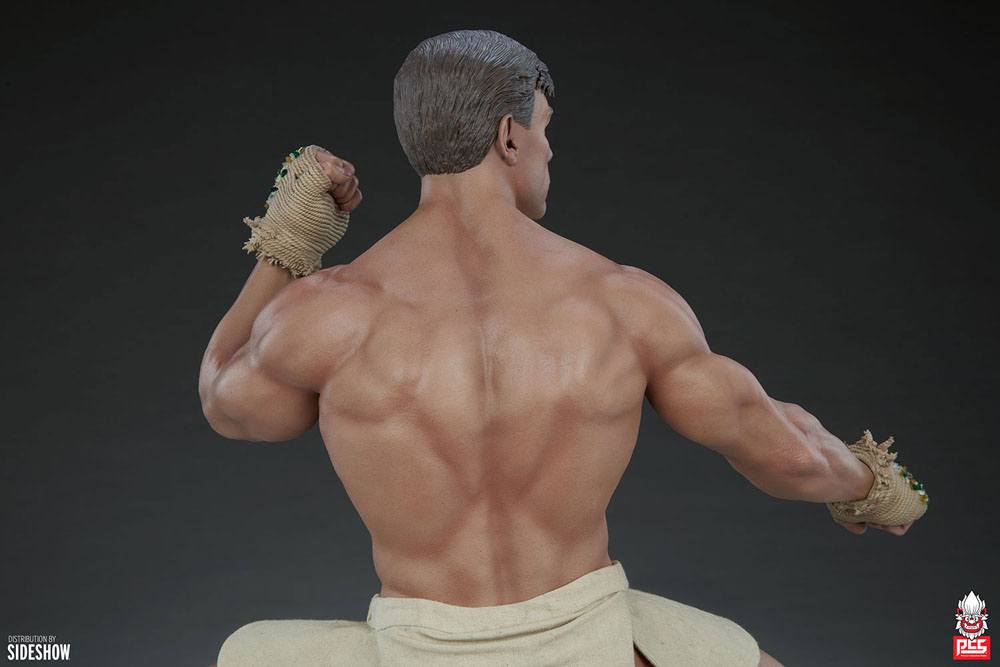 Statyn är inspirerad av Van Dammes starka passion för kampsport och har en skulpterad kropp, skulpterade tygremmar runt händerna och traditionella Thailändska Muay Thai shorts. Med en bred, kraftfull pose på en bronsmålad bas med drakdetaljer är denna samlarstaty ett måste för fans av Jean-Claude Van Damme och hans legendariska filmarv.