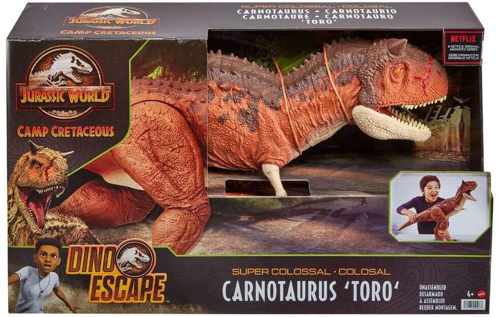 Get ready for thrilling action and adventure with Jurassic World Dino Escape! Inspired by the Jurassic World: Camp Cretaceous series, this Super Colossal Carnotaurus "Toro" dinosaur figure comes in a HUGE size and can SWALLOW MINI ACTION FIGURES WHOLE! Just let him chomp them up, then undo the latch on the belly to release them and start a new carnivorous storyline! Also features authentic sculpting, texture and color. Makes a great gift for ages 4 years old and up especially fans of the Jurassic World, dinosaurs and action play.