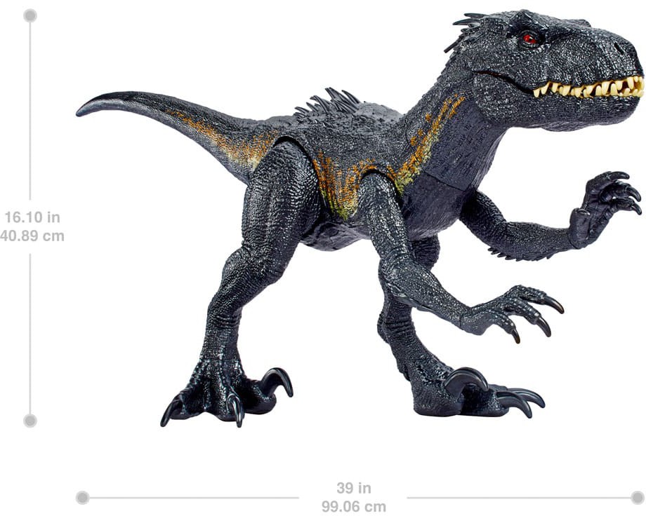 The Indoraptor goes Super Colossal! This dinosaur toy is more than 3 feet long and 16 inches tall and stars a key Jurassic World villain from Jurassic World: Fallen Kingdom. Its signature fierce appearance includes huge claws, wide-opening jaws, overlapping teeth and menacing red eyes. It doesn't just look aggressive -- it can swallow up to 20 mini dinosaur figures. (Minis sold separately.) A latched door in the belly releases the mini figures. For ages 4 years and up. Colors and decorations may vary.