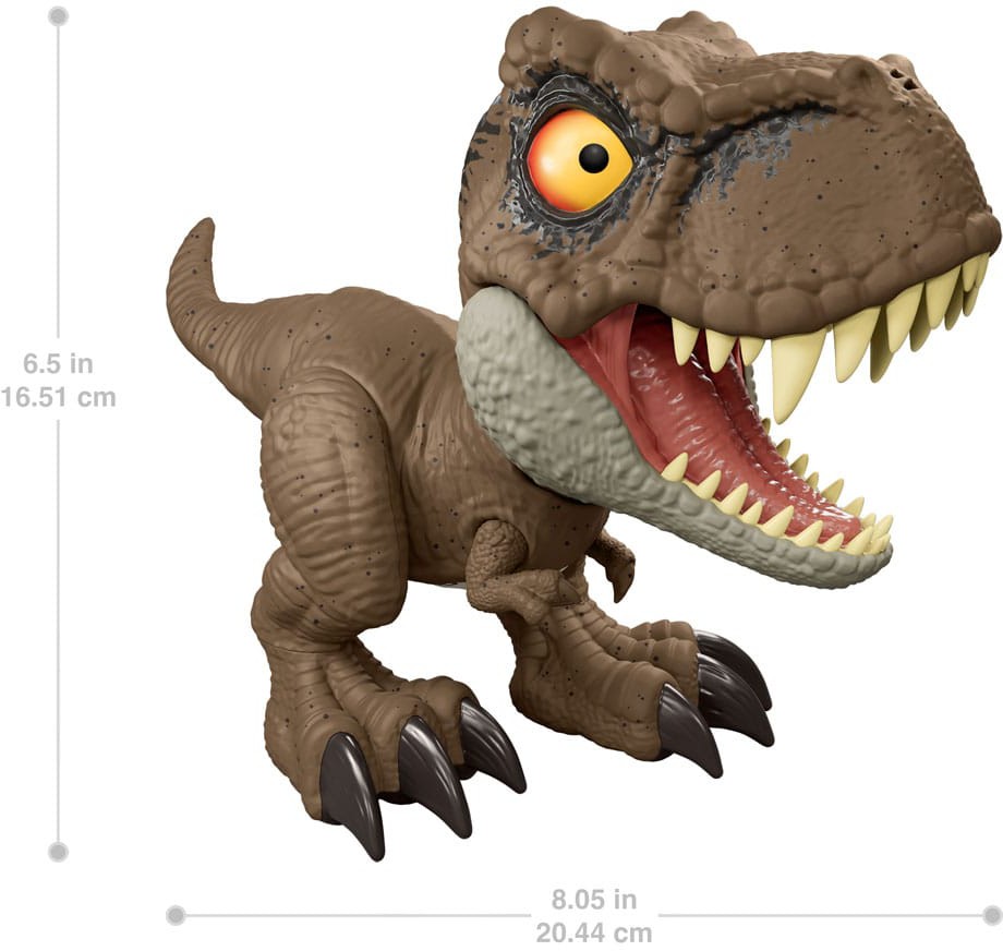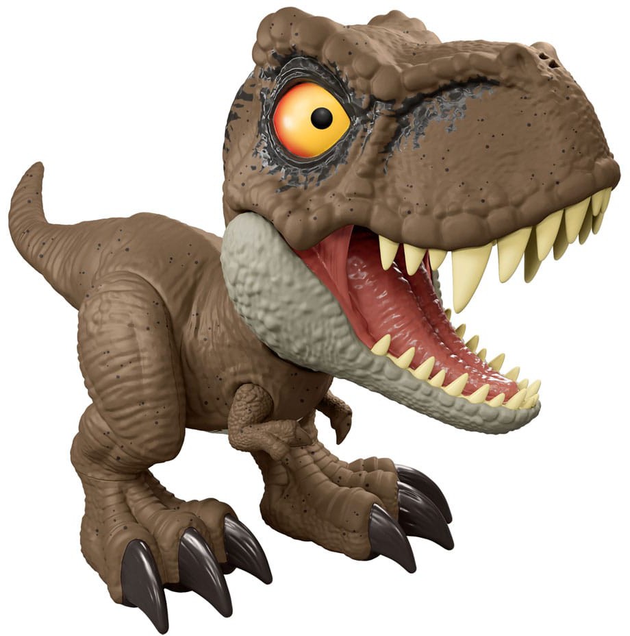 Denna Tyrannosaurus rex stiliserade dinosaurie ger fansen ett helt nytt sätt att interagera med sin vilda Jurassic World-favorit. Denna T. rex-figur har en specialfunktion som låter fans spela in fraser som översätts till ”dinosauriespråk”! Tryck bara på och håll in knappen på baksidan av huvudet och tala sedan för att spela in. Släpp knappen för att höra det komma ut som ”dinosaurieprat”! Vrid sedan på svansen på denna figur för att se en attack i flera riktningar och höra dinosaurievrål! Passar utmärkt som present till dinosauriefans från 4 år och uppåt.