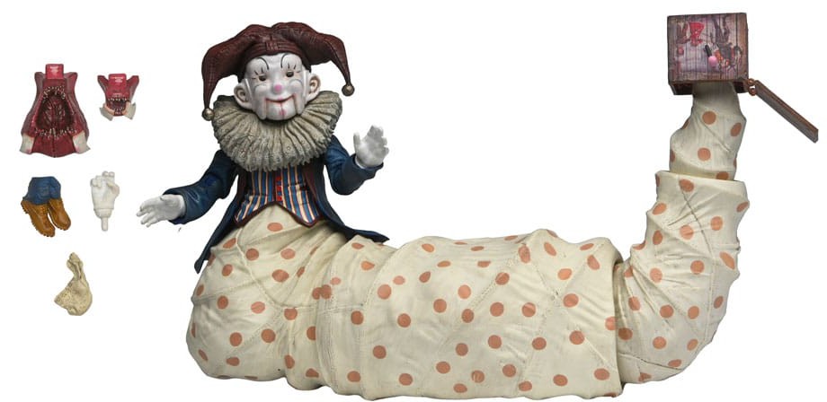The murderous jack-in-the-box from the 2015 spooky Christmas film Krampus is now a deluxe NECA action figure ready to spread some yuletide fear! At over 10 inches long, this incredibly detailed Der Klown figure is the perfect chilling addition to your annual holiday horror display and comes with a variety of accessories. Looking just like his creepy on-screen counterpart, this figure has an articulated tail which ends in his jack-in-the-box, complete with hinged lid. The figure also comes with three interchangeable mouth pieces with articulated mouth covers to let you show off his different menacing expressions throughout the film. Other accessories include an extra hand, interchangeable neck ruffles, handkerchief, and Jordan's legs, which plug into the monster's large, open mouth to devour his naughty victim. This deluxe Der Klown figure comes in window bow packaging featuring artwork from his jack-in-the-box in the film.