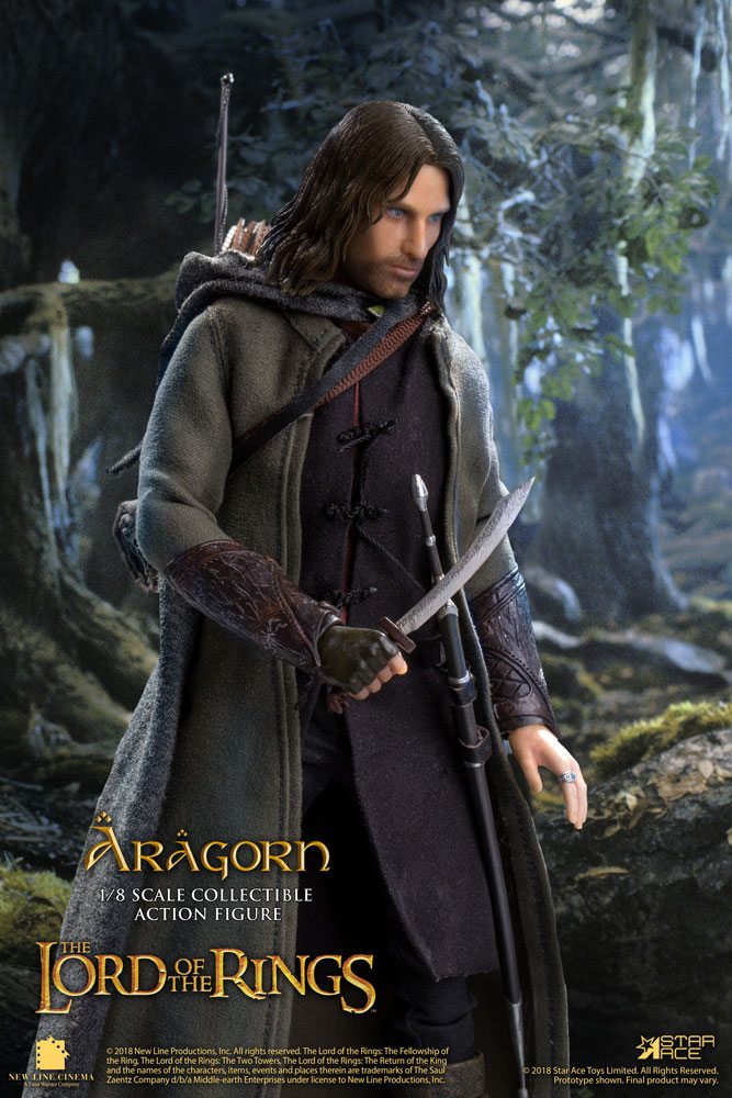 Aragorn, son of Arathorn, called Strider by the Hobbits was one of the great heroes of Middle-Earth. He helped in the quest to destroy the One Ring and led the armies of man in the battle against the dark lord Sauron. Star Ace brings Tolkien's hero to life in their new 1:8 scale Real Master Series with an authentic recreation of the character from the film The Lord of the Rings: The Two Towers. Offered in two formats, the normal version comes equipped with a sword and Elven dagger with the Deluxe Version adding a bow and arrows and a bedroll.