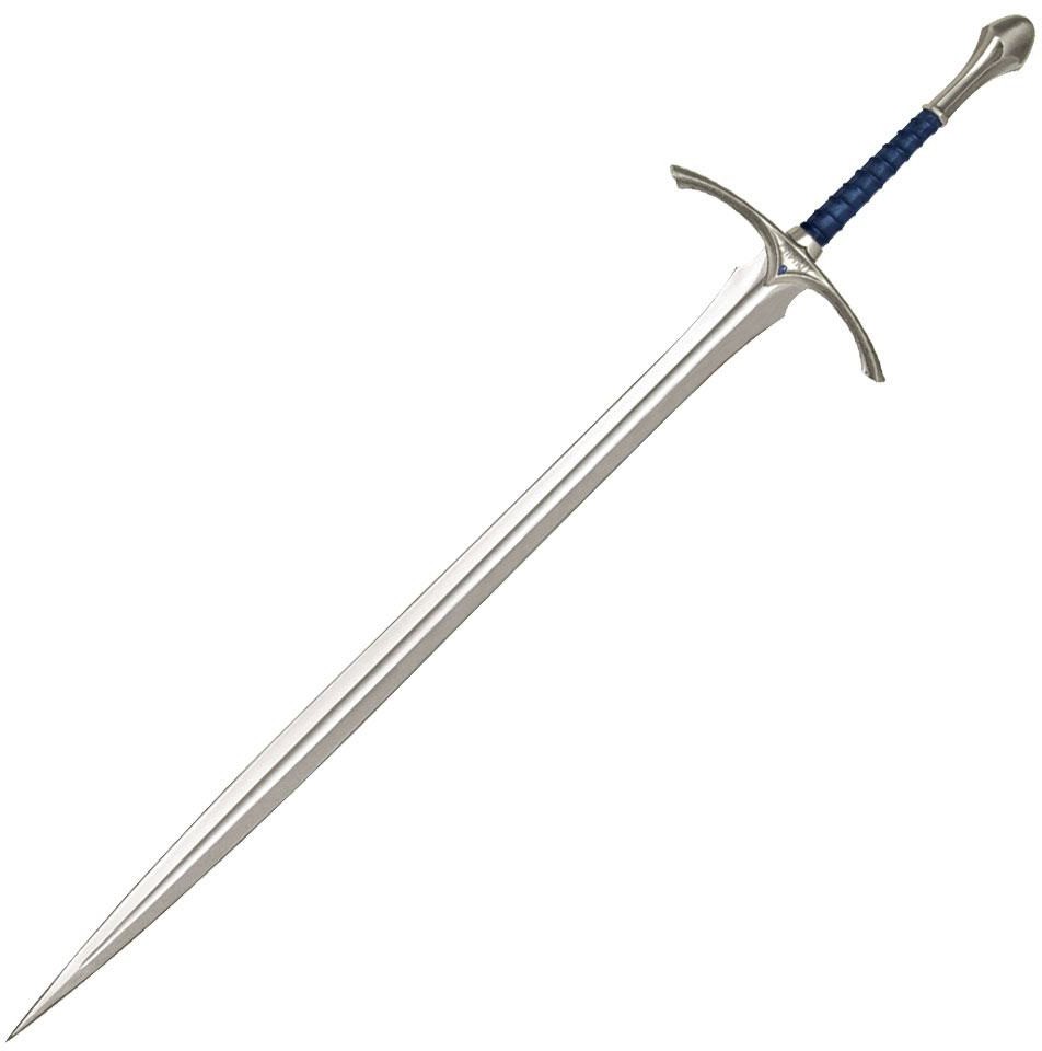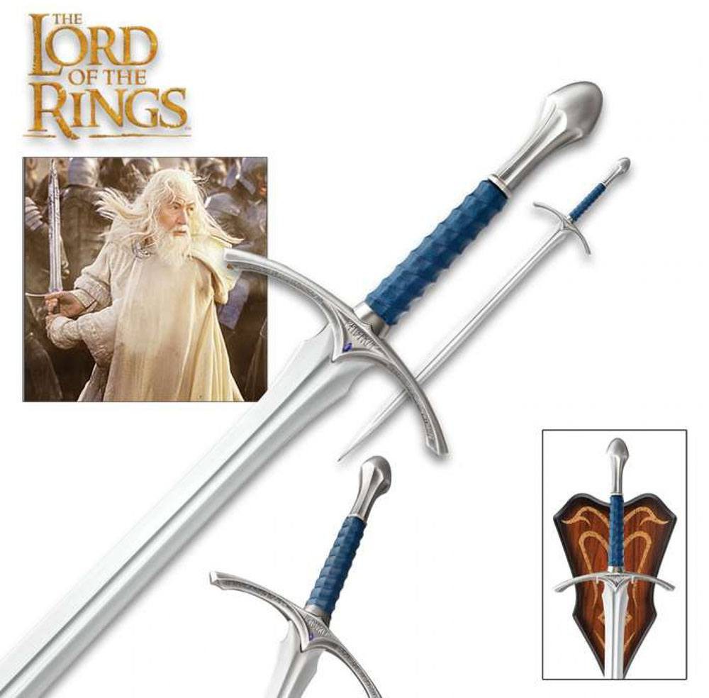 An ancient sword carried by Gandalf the Grey, who is an old, but powerful wizard and friend to Frodo Baggins. Glamdring, a magical sword, serves Gandalf in his mission to aid the Fellowship of the Ring. It was made by ancient Elves, and is inscribed with runes in the Elven language that say Turgon Aran Gondolin, Tortha gar a matha Glamdring, Vegil Glamdring gud daelo, Dam an Glamhoth which translates to Turgon, King of Gondolin, Wields, has and holds the sword Glamdring, Foe of Morgoth´s realm, Hammer of the Orcs.