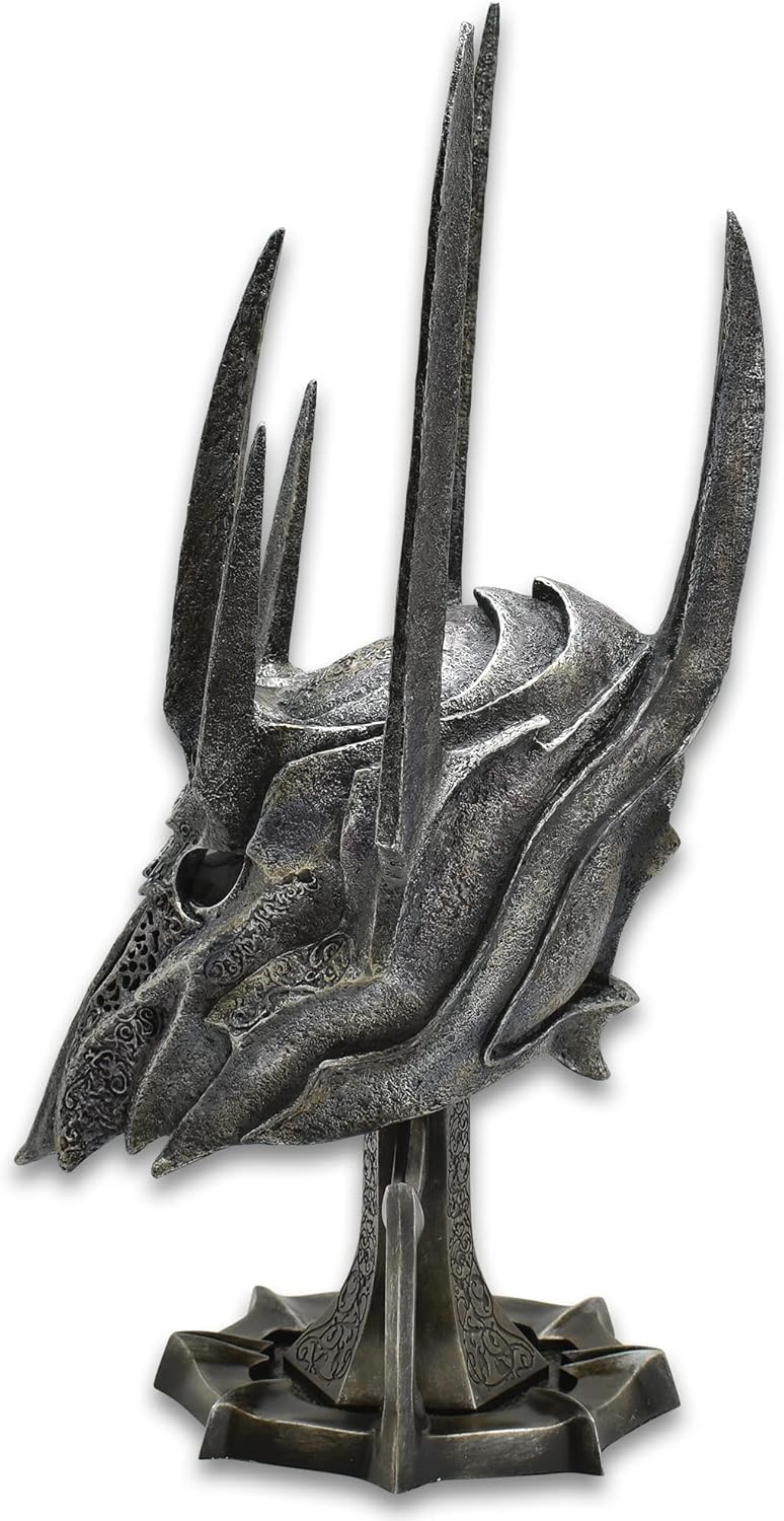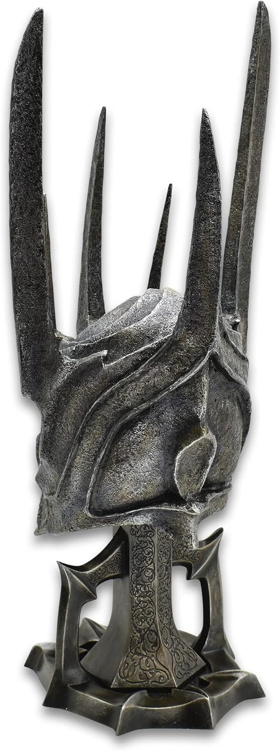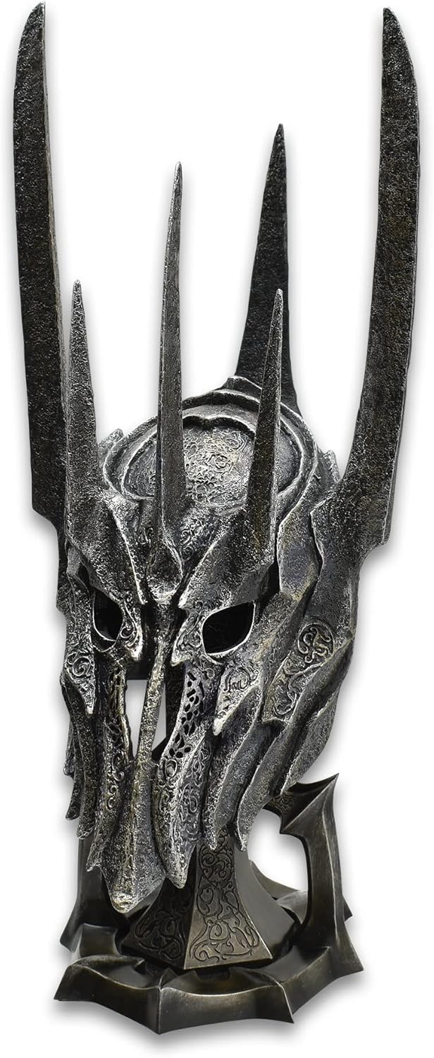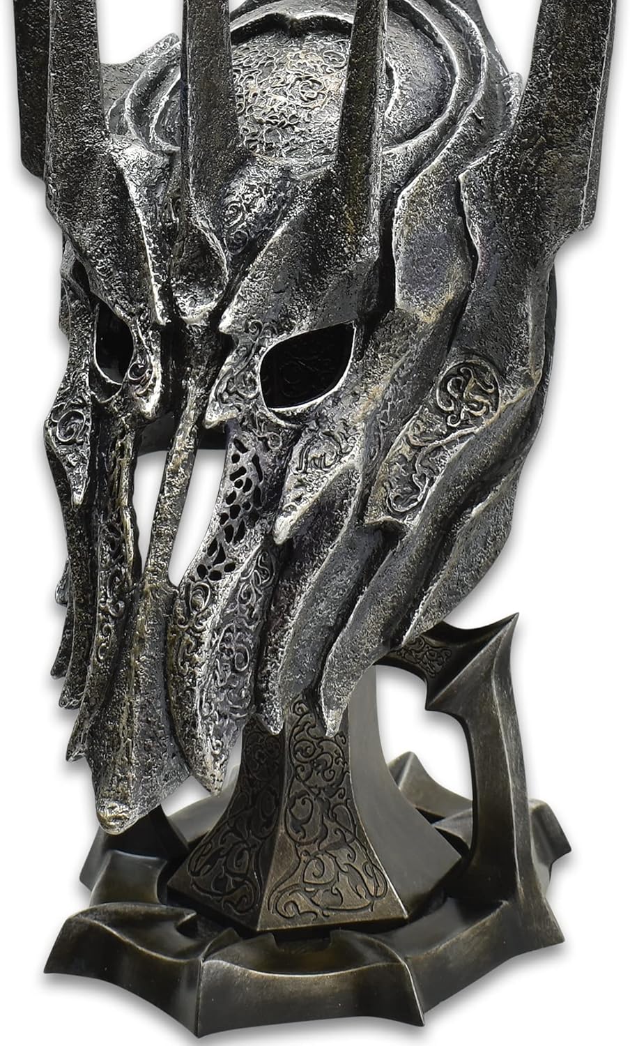 Denna replica i skala 1:2 av Saurons hjälm är ca. 40 cm hög och gjord i resin med en färg för att likna svärtat stål för att matcha filmens rekvisita. Kommer på en displaybas i polystone och med ett äkthetsintyg.