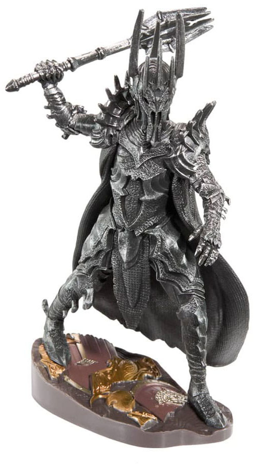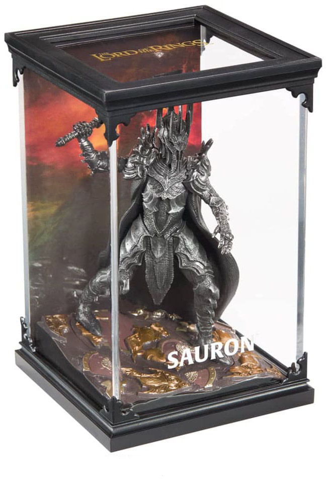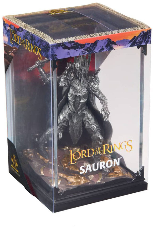 En fint utformad, intrikat målad skulptur av den mörke herren Sauron. Detta tredelade diorama innehåller ett lock med bakgrund, en bas och en avtagbar figur av Sauron. Mäter ca 17 cm i höjd. PVC-figur i akryllåda.