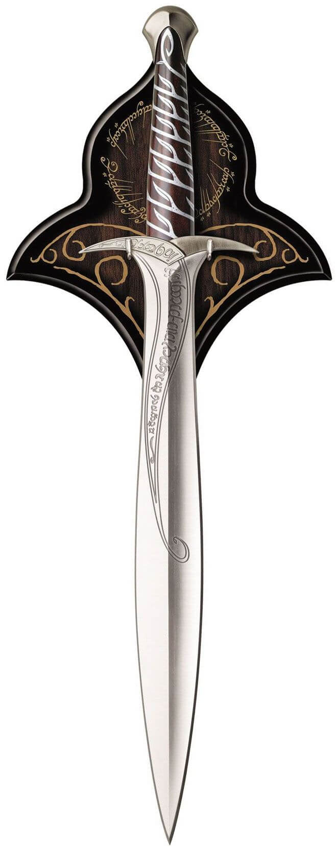 Sting is a sword that was given to Frodo Baggins by his cousin Bilbo, the original Ringbearer. It is up to Frodo and the chosen Fellowship to cast the Ring back into the fires of Mount Doom, where it was originally forged, and destroy it once and for all. Bilbo gives Sting, a sword made by Elves in the ancient days, to Frodo to serve him on his harrowing journey. Bilbo carried Sting with him when he originally acquired the Ring from Gollum. Sting´s blade glows when Orcs, the violent footsoldiers of Sauron, are present. Engraved on the blade and cross guard are runes in the Elven language of Sindarin that say Maegnas aen estar nin dagnir in yngyl im which translates to Maegnas is my name, I am the spider´s bane.