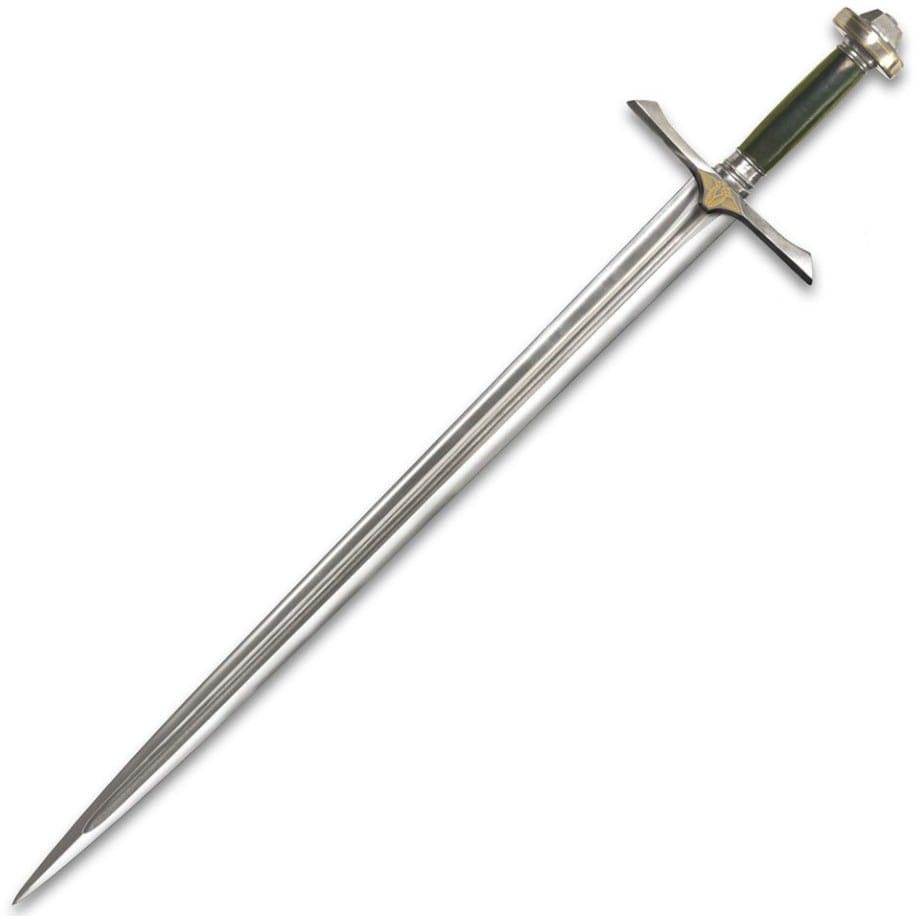 This authentically detailed sword replica is a reproduction of the actual filming prop sword crafted by Weta Workshop of New Zealand and used in THE LORD OF THE RINGS™ films presented by New Line Cinema. This meticulously detailed sword, with an overall length of 42", features a solid metal guard and pommel with an antique steel finish and a genuine leather wrapped grip. The cross guard is adorned with gold twin raven motifs and the pommel is accented with gold rings. The 33" false-edged blade is crafted of tempered stainless steel with a fuller groove. Each sword is presented with a wood wall display and certificate of authenticity.