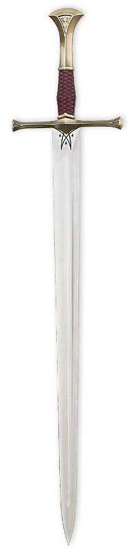 Officiellt licensierat svärdreplika från Sagan om ringen. Detta är Isildurs svärd, som skar ringen ur Saurons hand med det brutna fästet på sin fars svärd, Narsil. Det här föremålet är minutiöst återskapat med 420 rostfritt stål för bladet. Det gjutna metallhandtaget har ett läderlindat grepp och en pommel med One Tree-bilden. 93 cm långt blad, 120 cm totalt.