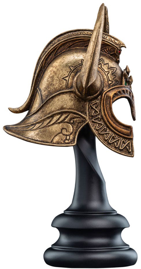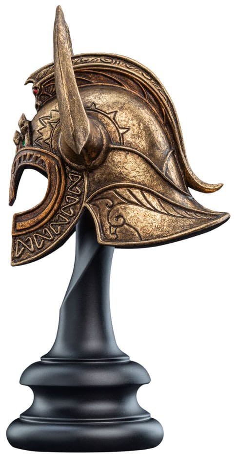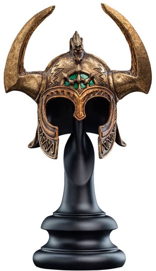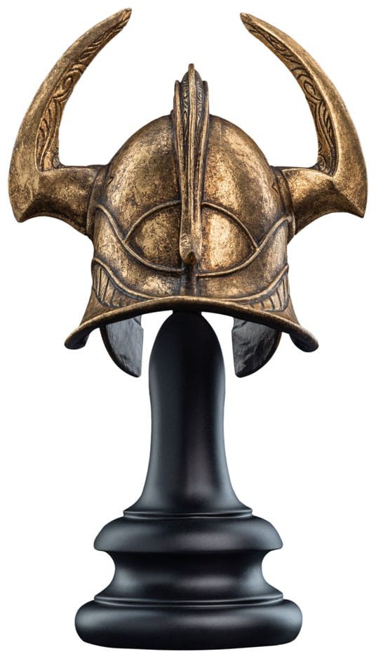 Under dessa dagar av bitter vinter fanns det ingen som stod högre än Helm, för hans anda var som ett berg av järn inför hans fiender. Klädd i en mäktig hjälm och beväpnad med en kraftig näve skyddade han sitt folk lika hårt som trollen som vandrade runt de snöklädda kullarna. Kung Helm av Rohan var i sanning en krigsherre och använde sin styrka mot alla som hotade Riddermarken, och skuggan av hans beslutsamhet låg länge över hans fienders hjärtan. King Helms Helm är ett bevis på expertisen och passionen hos våra erfarna hantverkare från Midgård. Weta Workshops konceptkonstnär Daniel Falconer byggde vidare på det som designades för The War of the Rohirrim och återskapade hjälmen från den ursprungliga 2D-animationen som en fullt fungerande rustning, sliten och stridsskadad av historien. Expertskulptören Shaun Bolton skapade sedan designen i lera och gav liv åt varje ås, buckla och sliten kant med den autenticitet som bara årtionden av erfarenhet kan ge. Falconer och Bolton har båda arbetat med filmtrilogin om Sagan om ringen och har kanaliserat sitt engagemang för Midgård till denna invecklade relik i miniatyr som inte bara fångar kung Helms makt utan också Rohans tidlösa arv.