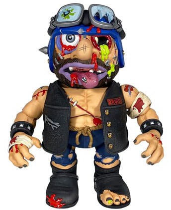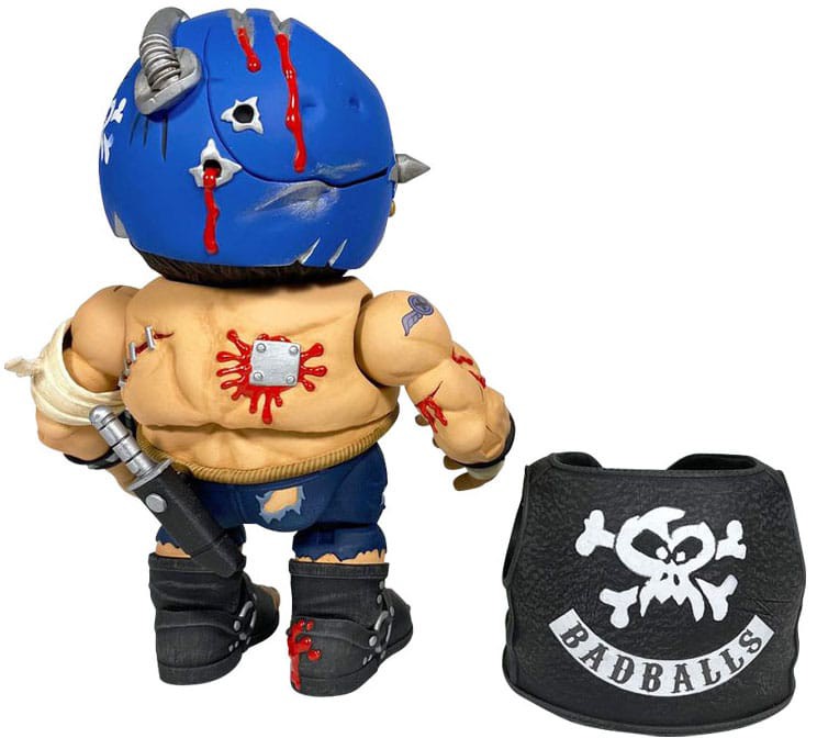 Badballs Biker Edition Bruise Brother innehåller avtagbara skyddsglasögon, kniv med slida, väst, bandage och avtagbar hjälmpanel med stridsskador som avslöjar sprucken skalle och maskig hjärna!