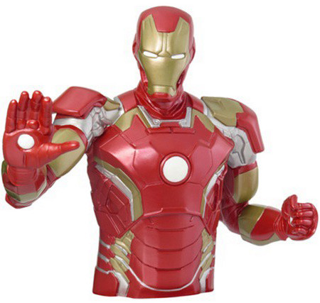 Marvels Iron Man som snygg Bust Bank. En ca 20 cm hög sparbössa i vinyl. Detaljrikt målad och med en liten springa för mynt och sedlar i ryggen.