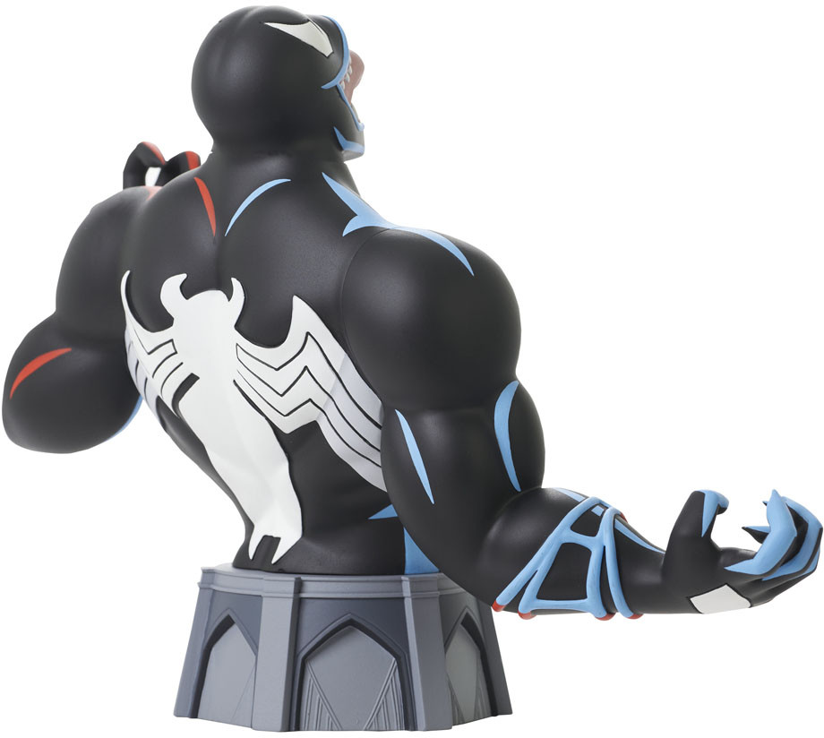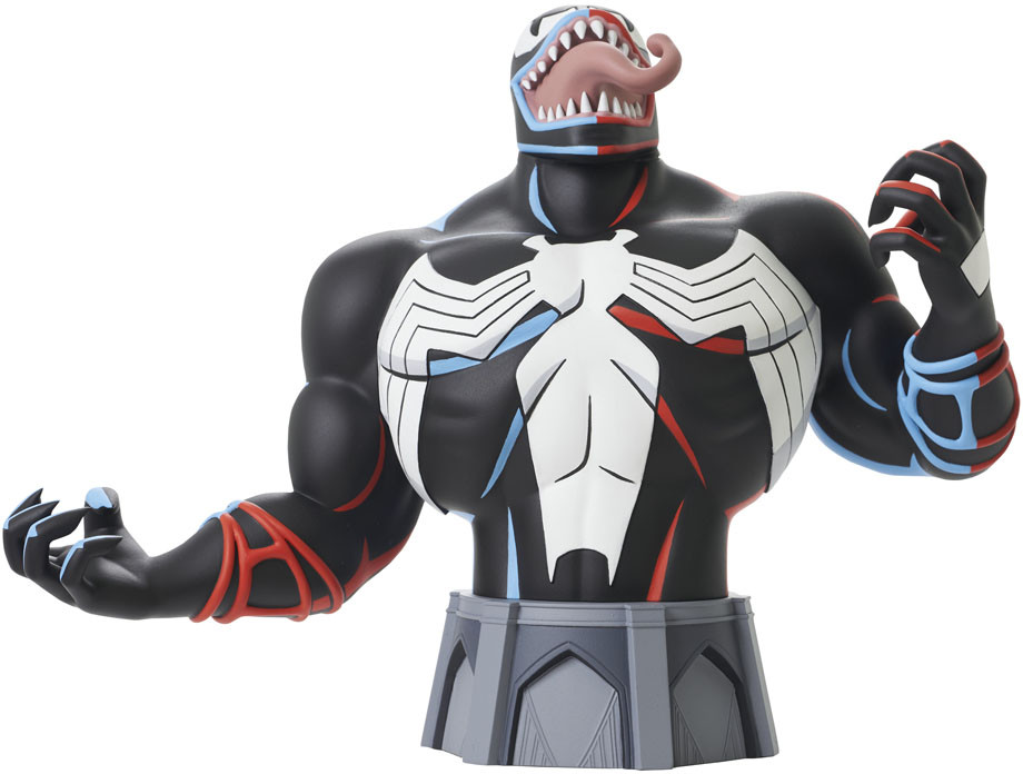 Se upp, Spider-Man! Ur 1990-talets klassiska Spider-Man: The Animated Series kommer denna miniatyr-byst av Venom i rätt skala och med hans animerade utseende. Han är redo att festa på Spideys hjärnor! Denna ungefär 15 cm stora miniatyr-byst är begränsad till endast 3000 exemplar och levereras i en fullfärgad låda med ett numrerat äkthetsintyg. Designad av Barry Bradfield, skulpterad av Paul Harding!
