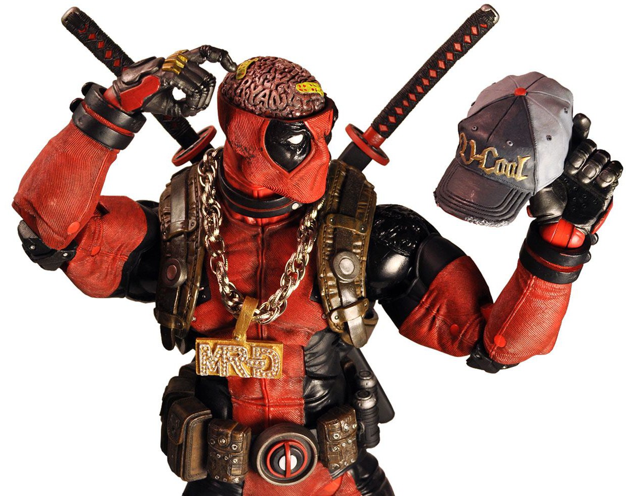 Ultimate Deadpool stands 45 cm tall, with over 30 points of articulation for great action poses, and he's loaded with new accessories. The figure comes with three interchangeable head sculpts, interchangeable hands, and a bounty of weaponry with working holsters and sheaths. The full list of accessories includes: machine gun, assault rifle and pistol, each with a detachable blast effect; katanas; sai; knife; "MR-D" medallion necklace; baseball cap; melted cheese pizza toppings; unicorn; and, of course, a chimichanga.