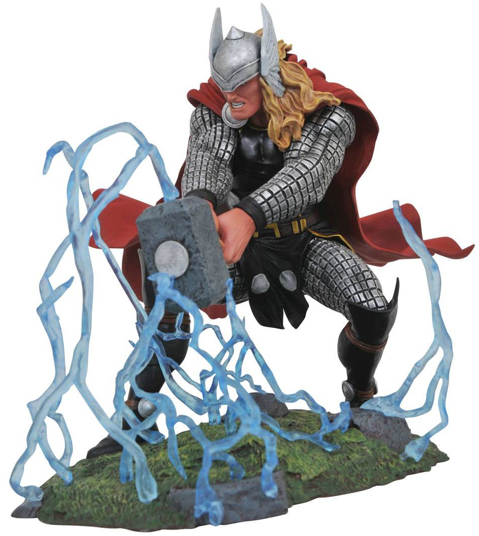 By the power of Mjolnir! The Asgardian God of Thunder returns to Midgard - and the Marvel Gallery PVC line - in the form of this electrifying diorama! This sculpture of Thor in his modern garb captures him mid-strike, with lightning coursing through his hammer Mjolnir and into the ground. Made of high-quality vinyl with exacting paint details, this 20 cm sculpture comes packaged in a full-color window box. Designed by Caesar, sculpted by Mat Brouillard.