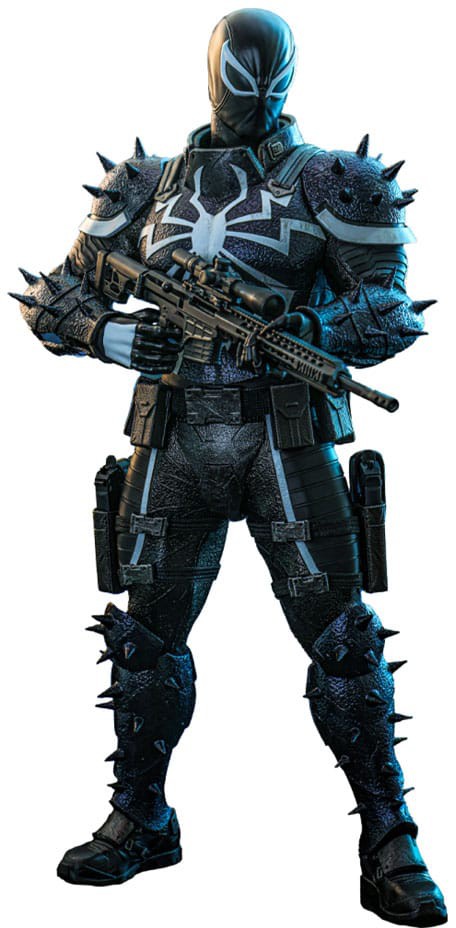 Meticulously crafted based on Marvel Comics, the Agent Venom action figure features a newly crafted head sculpt with interchangeable eye pieces, a specialized body that naturally portrays Agent Venom's muscular physique, a symbiotic armor with spikes showcasing a military theme, an interchangeable symbiotic blade forearm, two styles of tendrils attachable to figure's back, two strings of webbing accessories, a series of firearms including sniper rifle, machine gun, submachine guns, pistols, and lastly a specially designed figure base with the character's name.