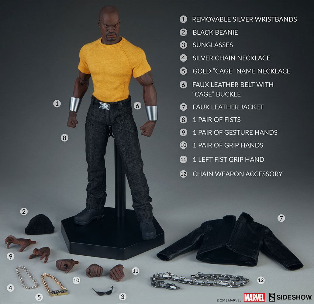 The Luke Cage Sixth Scale Figure has a custom-tailored fabric costume with a yellow t-shirt and black jeans with a leather-like belt and "CAGE" buckle, as well as a black fabric beanie and leather-like jacket. He also includes a pair of removable silver wristbands, a silver chain necklace, a gold "CAGE" name necklace, a pair of sunglasses, and a chain weapon accessory.