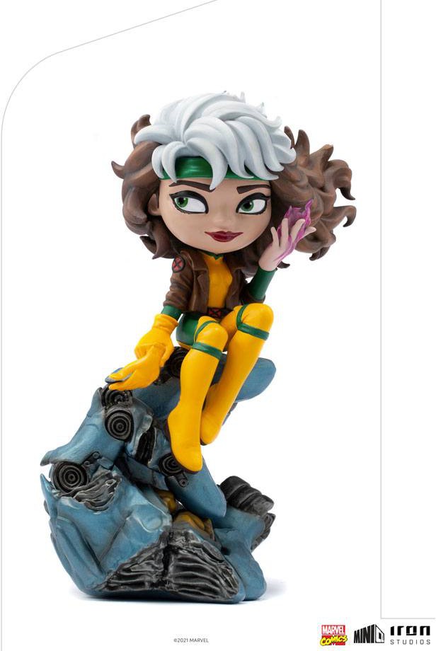"Rogue - X-Men - MiniCo - Iron Studios" statue shows the young Anna Marie, better known as Rogue, sitting on the hand of a destroyed Sentinel. She gazes passionately at her teammate Gambit while, by touching her face, absorbs her beloved teammate's thoughts and feelings through the hero's psionic energy. With the mutant power to absorb vital and psychic energy from others through skin-to-skin contact, she absorbed some of Captain Marvel's cosmic alien powers acquiring super-strength, invulnerability, and the ability to fly.