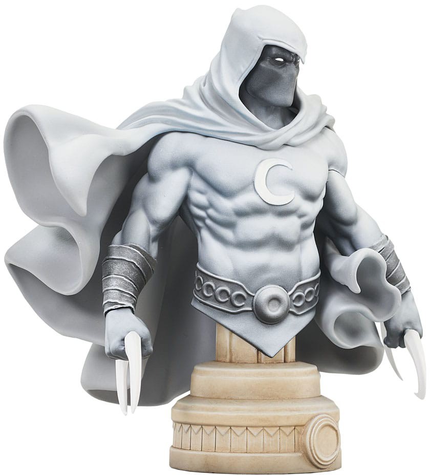 Fienden kan se honom komma, och nu kan du också göra det! Denna 13 cm stora minibust i resin i skala 1/7 av Marc Spector, alias Moon Knight, föreställer honom med böljande slängkappa och halvmånepilar i båda händerna, ovanpå en piedestal med egyptiskt tema. Den är begränsad till endast 2 000 exemplar och levereras i en färgglad låda med ett numrerat äkthetscertifikat. Designad av Nelson X. Asencio, skulpterad av Juan Pitluk!