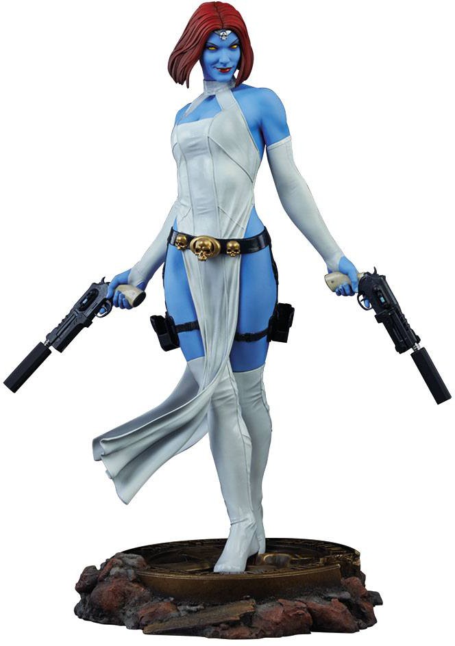 Mystique measures 48 cm tall, stepping over a base of rubble from Xavier's School for Gifted Youngsters, imprinted with a powerful punch from the Juggernaut. The Mystique Premium Format™ Figure features an entirely-sculpted white dress costume, as well as boots and gloves. She wields two firearms at her sides, and also includes a black sculpted belt and holsters adorned with golden skull accents and buckles.