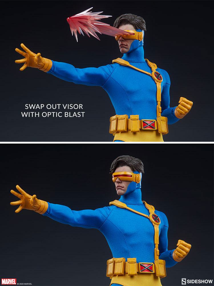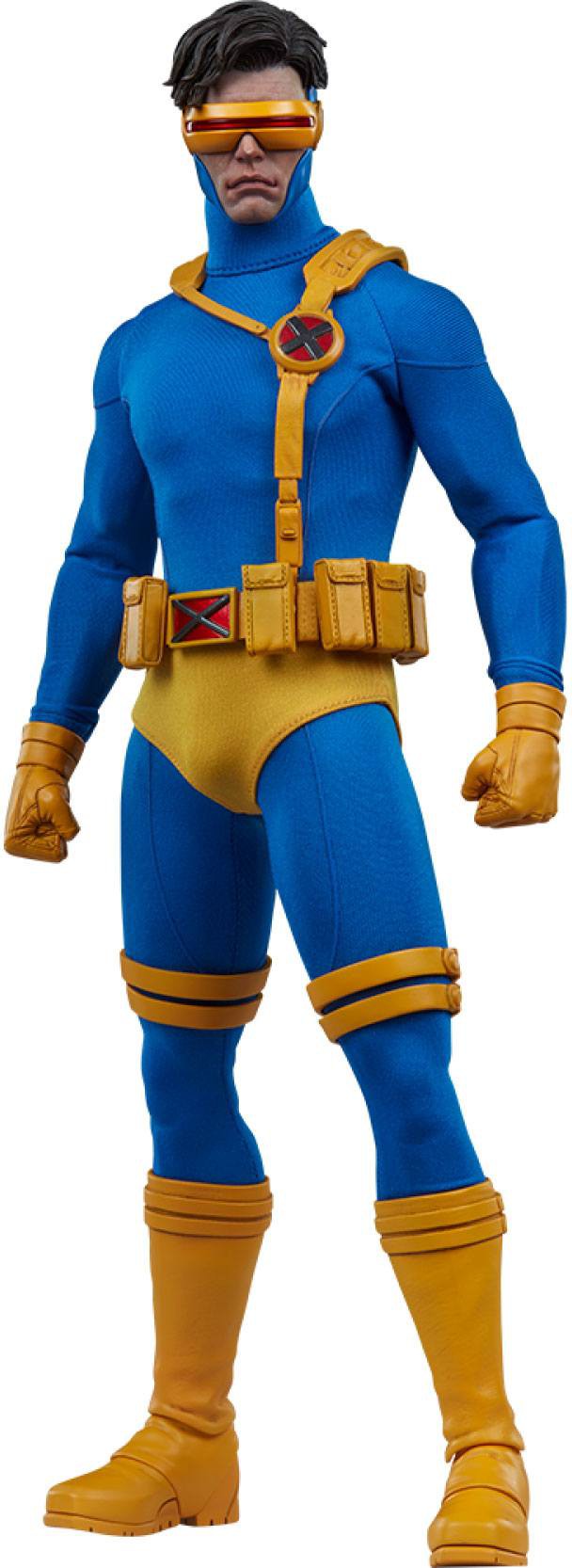 Cyclops Sixth Scale Figure är inspirerad av sin X-Men Blue-teamuniform från 90-talet och har en detaljerad huvudskulptur baserad på Scott Summers serietidning, komplett med sin blå mask och signaturröd-och gula visir. Hans dräkt innehåller en blått tygbodysuit, gula tyg underbyxor, ett tyg bälte och skulpterade gula accenter som hans bälte påsar, bröst sele, stövlar och lår band. Två röda 'X' spännen lägger till en extra färg i Cyclops uniform, och figuren levereras också med ett brunt läderliknande jacktillbehör för att komplettera sitt klassiska utseende.