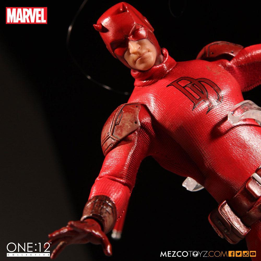 Mezco Toyz would like to introduce The One:12 Collective Daredevil figure. This fully posable action figure stands approx 16 cm tall.. Includes a display base as well as a multitude of accessories and comes with base in a window box packaging.