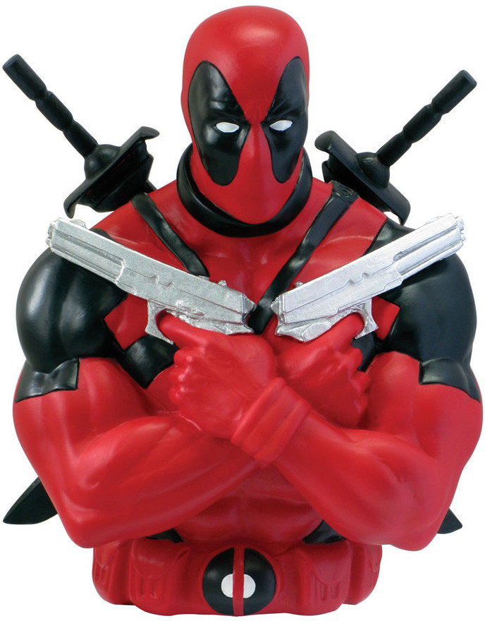 Marvels Deadpool som snygg Bust Bank. En ca 17 cm hög sparbössa i vinyl. Detaljrikt målad och med en liten springa för mynt och sedlar i ryggen.