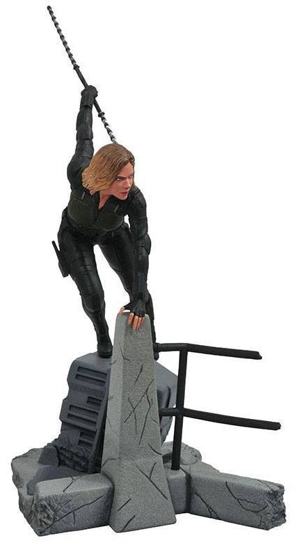This 23 cm scale sculpture of Black Widow shows her leaping over obstacles with her battle staff in hand. Featuring detailed sculpting and collectible-quality paint applications, this PVC plastic diorama comes packaged in a full-color window box. Sculpted by Rocco Tartamella!